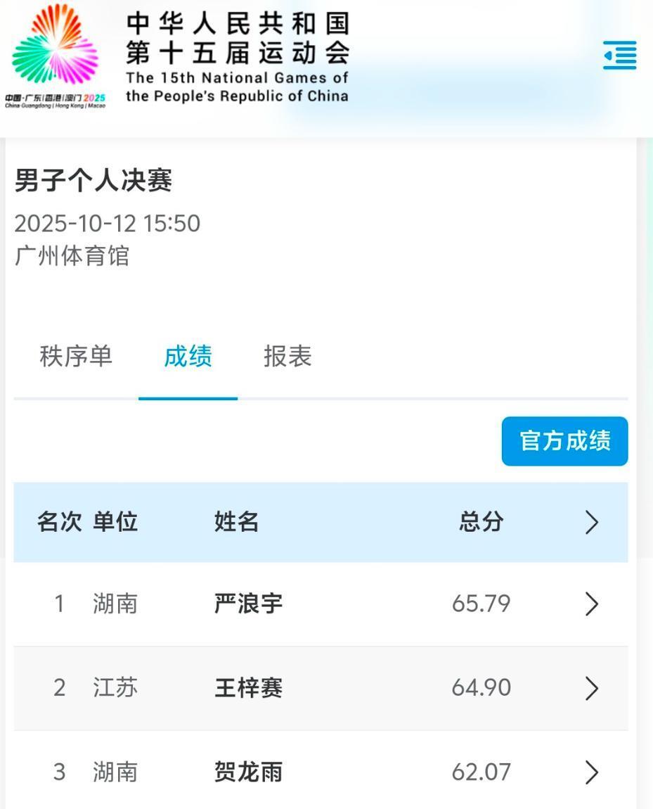 10月12日,第十五届全国运动会蹦床比赛男子网上个人决赛于广州体育馆落幕。巴黎奥运会铜牌得主、来自湖南株洲醴陵的湖南高速蹦床队选手严浪宇,凭借一套难度高达22.10分的动作,以总分65.79分强势夺冠,这枚金牌也成为湖南运动员在本届全运会竞技项目中收获的首金。